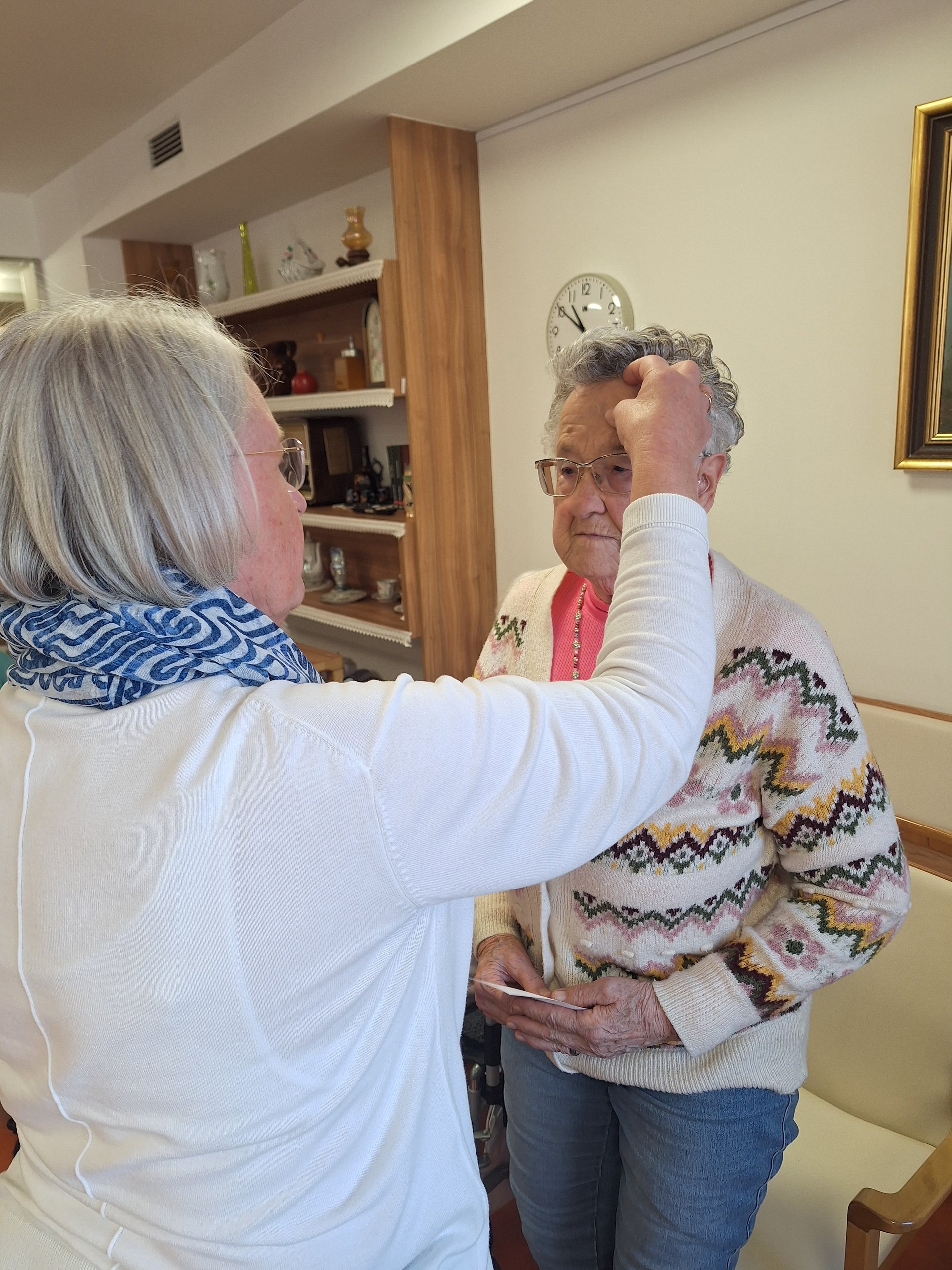 Unsere ehrenamtliche Mitarbeiterin Wilma Prenner ist eine ganz besondere Frau. Mit viel Empathie versteht sie es, Bewohnerinnen und Bewohner immer genau dort “abzuholen”, wo es gebraucht wird und notwendig ist. Vielleicht liegt diese Gabe auch ihrer Ausbildung zugrunde? Frau Prenner ist Religionslehrerin und außerdem “beauftragter Laie”, dh. sie ist u.a. dazu berechtigt Wortgottesdienste zu halten und das Aschenkreuz zu spenden.